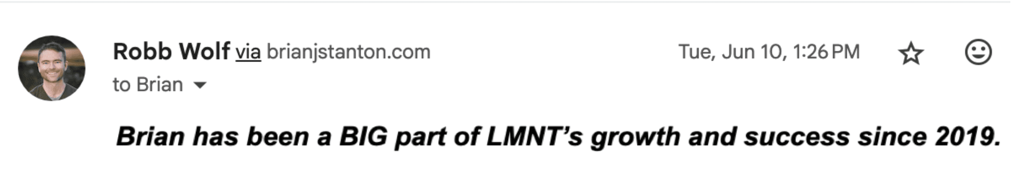"Brian has been a BIG part of LMNT's growth and success since 2019." -Robb Wolf, LMNT Founder & NYT Best-Selling Author.
